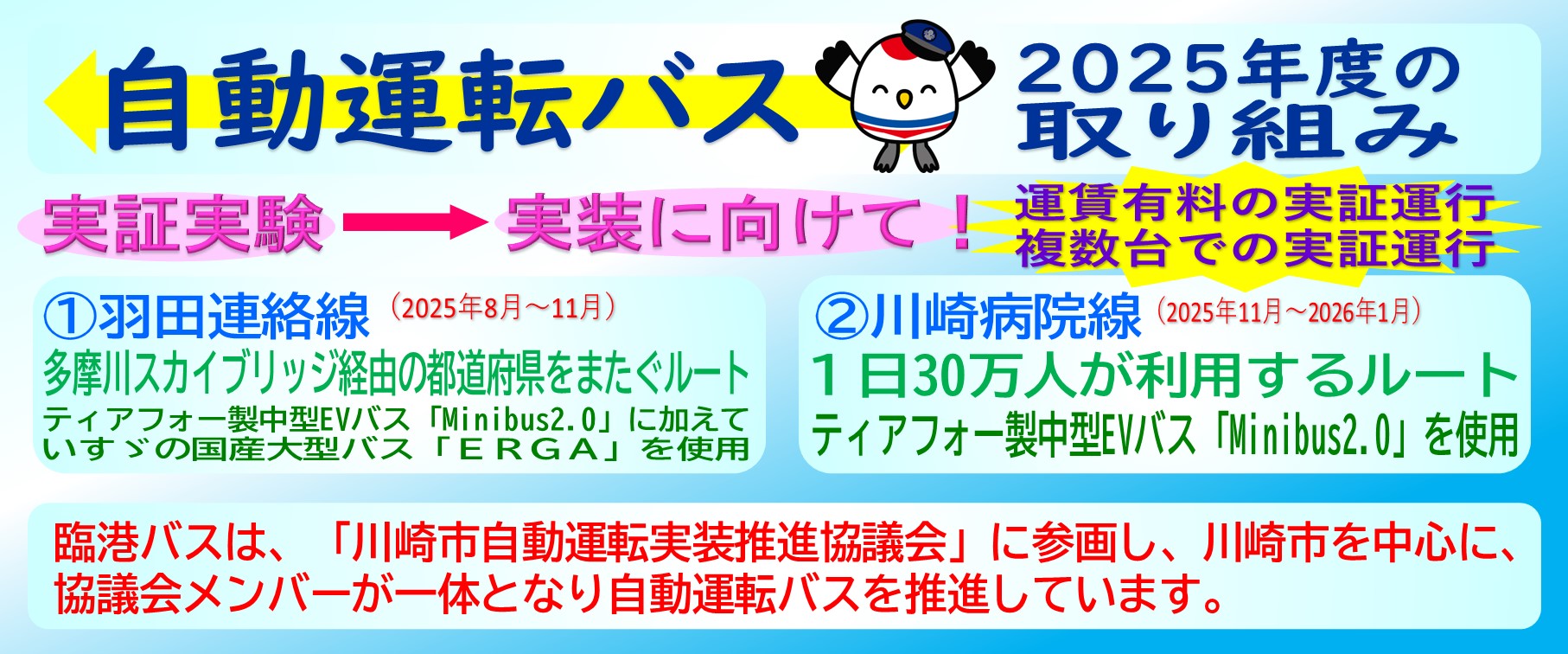 自動運転バス2025年の運行 バス運転士 X Facebook はてブ Pocket LINE コピー 2025.07.11 臨港バスでは、川崎市と協力し、「川崎から全国へ」を合言葉に、自動運転バスの実装を進めています!今年はついに運賃有料での運行を開始します。協議会のメンバーは様々な分野で活躍する会社ばかり!そんな熱い川崎市で臨港バスの一員として活躍しませんか。運転士・整備士・運行管理者募集中! https://t.co/YIrRRFj0qD— 臨港バス 会社&採用情報 by 臨雇対【公式】 (@rinko_koyo) July 11, 2025