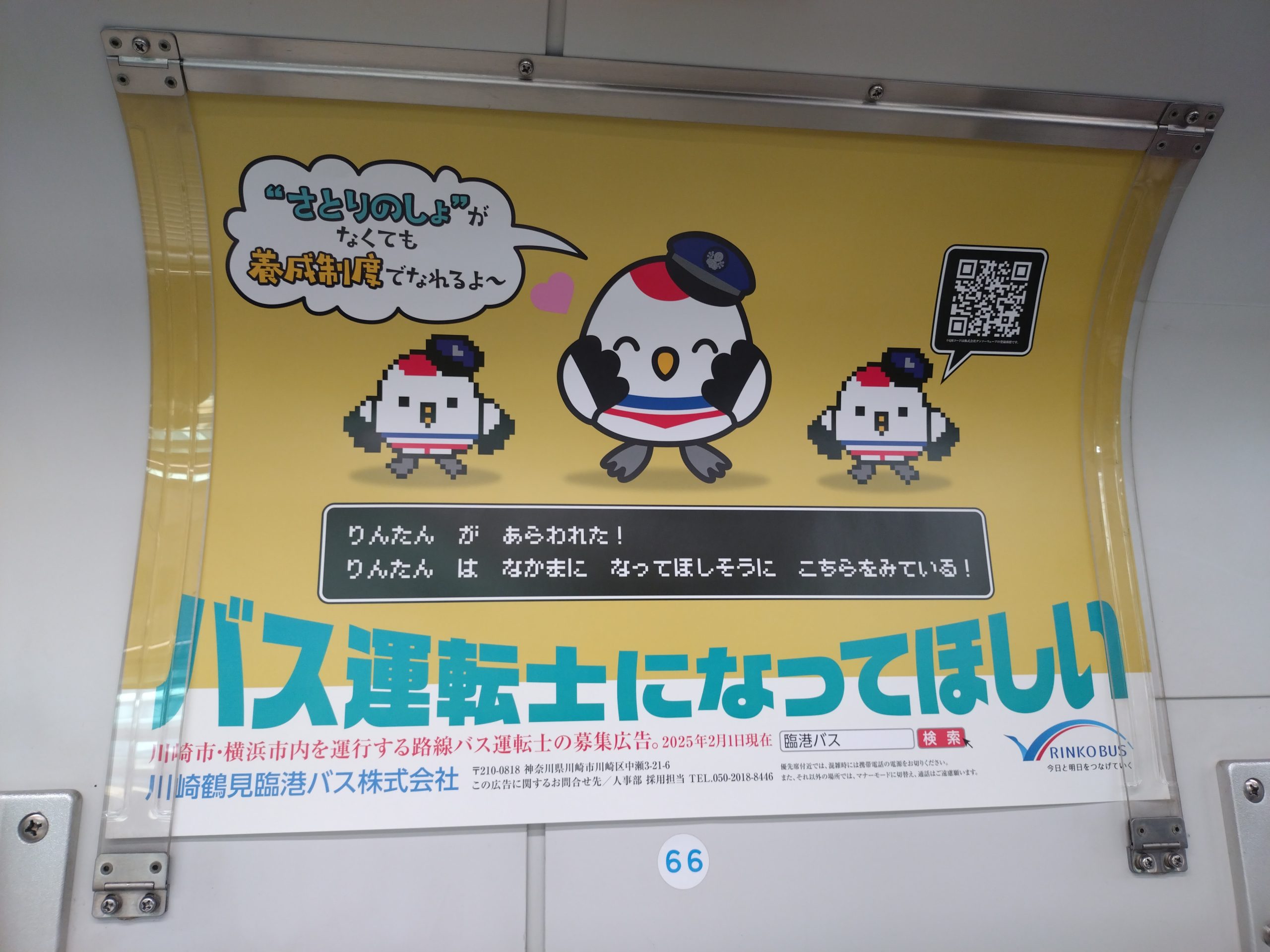 臨雇対では、2月1日から末日まで、JR線まど上広告を実施しています。今回は、南武線、横浜線、京浜東北線・根岸線、湘南新宿ライン・上野東京ライン、中央線・総武線各駅停車!レベル20でなくても、「さとりのしょ」なくても転職・入社できます!#臨港バス#りんたん#バス運転士#ぼんじり pic.twitter.com/bQ5UPi9VXL